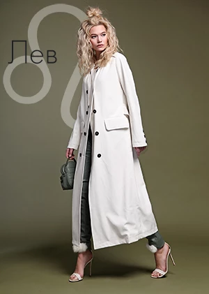 Двубортный белоснежный плащ из эко кожи NAUMI подчеркнет хрупкую фигуру и сильный характер безупречных Львов.